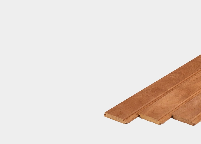 Интерьер построен на выразительном диалоге двух оттенков благородной ольхи. Стены, обшитые широкой (140 мм) вагонкой из черной ольхи сорта «Экстра» в удлинённом формате (2500 мм и 3000 мм), создают эффектную, глубокую и графичную основу, напоминающую тёмную воду. Этот насыщенный фон контрастирует с более светлой и уютной текстурой термоольхи реечного профиля (80 мм), добавляющей пространству тепла, воздуха и тактильной мягкости.