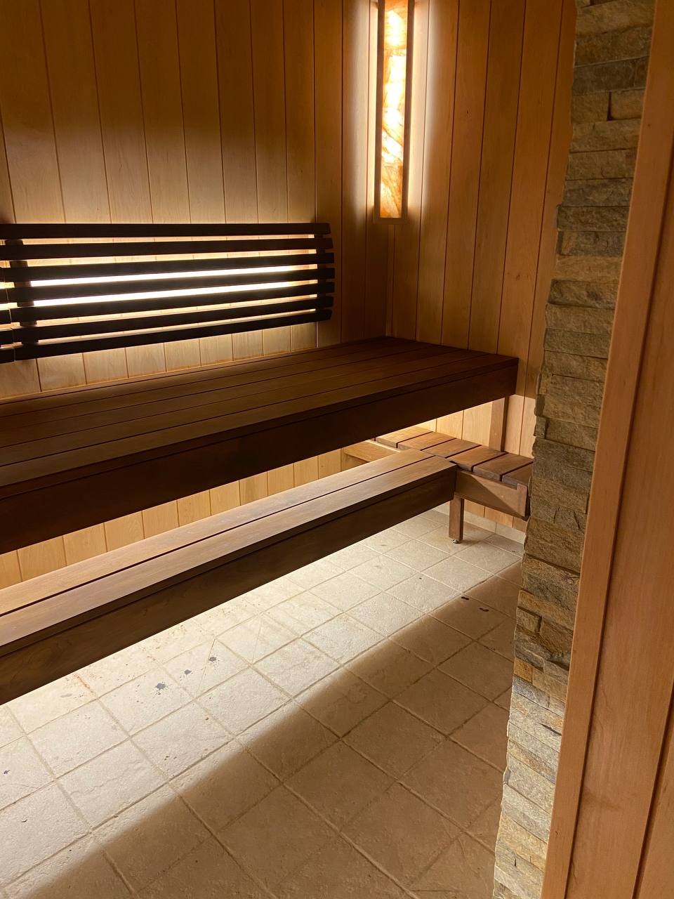 Главной световой доминантой и арт-объектом становятся светильники из гималайской соли в авторской светлой рамке. Их тёплое, живое свечение, проходящее сквозь природный кристалл, создаёт на стенах из чёрной ольхи уникальные переливы, похожие на отблески заката на воде, наполняя парную целебными микроэлементами и успокаивающей энергетикой.