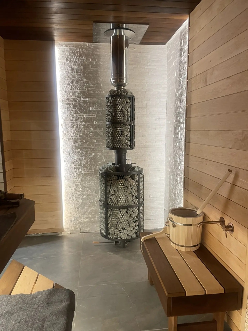 Для ухода за древесиной использованы специальные составы: масло для полков SATU LAUDESUOJA и воск для сауны SATU SAUNAVAHA, которые подчеркивают естественную красоту дерева и обеспечивают его защиту. Двери модели «Престиж Графит» с коробкой из ольхи, а также обливное устройство «Каскад» от Woodson добавляют в проект ноты современного дизайна и функциональности.